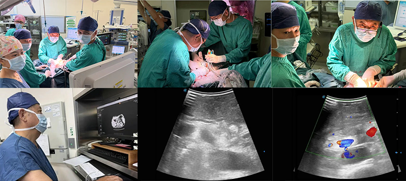 患者在手术室行开腹下纳米刀肿瘤消融术,术者在术中超声引导下开始布针,共进4根针,确保电极区域包裹肿瘤后,麻醉医生为患者注射肌松药物,随后开始消融。术中根据电流反馈多次测试调整消融参数完成消融,消融过程中电流上升反馈良好,无不良反应,手术全程在直播下清晰可见。