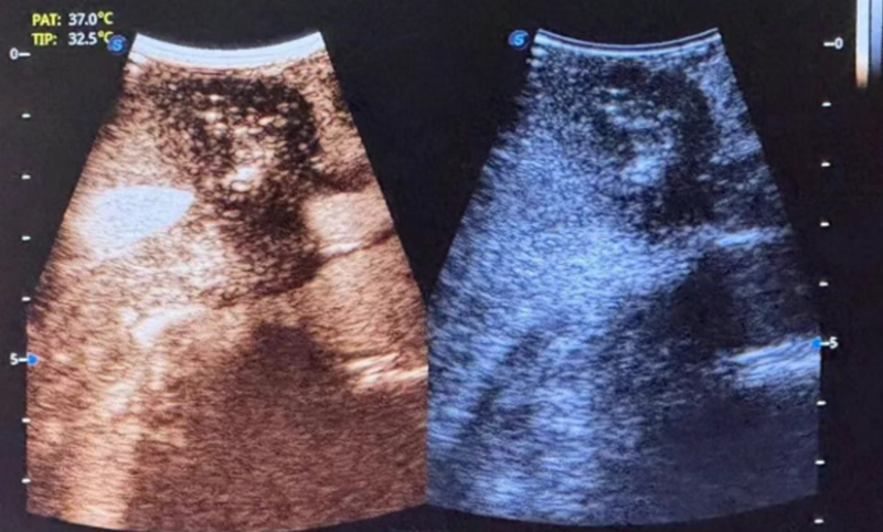 术后超声造影显示肿瘤部位呈无血供现象,周边血管结构保存完整,消融效果良好且安全。消融完成后,术者退出电极针,手术顺利结束,术后给予对症支持治疗,患者恢复良好。