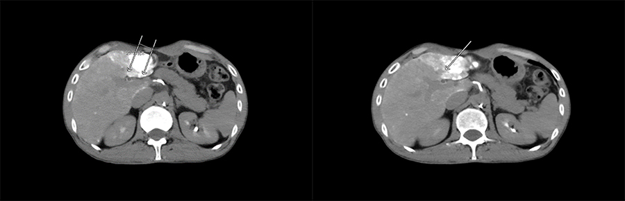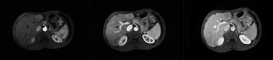 44岁男性,因“诊断HCC2年余,腹痛1周。”入院,完善上腹部MRI及肿瘤指标,考虑肿瘤复发.影像检查显示:肝S3段异常信号范围较前略增大。综合平扫+DWI诊断:肝S3、4、8段异常信号,考虑Ca介入术后改变,未见明显活性残留,肝S3段考虑Ca复发,范围较前略增大。肝尾叶略大,肝实质多发增生结节。病灶大小约为3.5(左右)x3cm(胸背)x3cm(头足)。