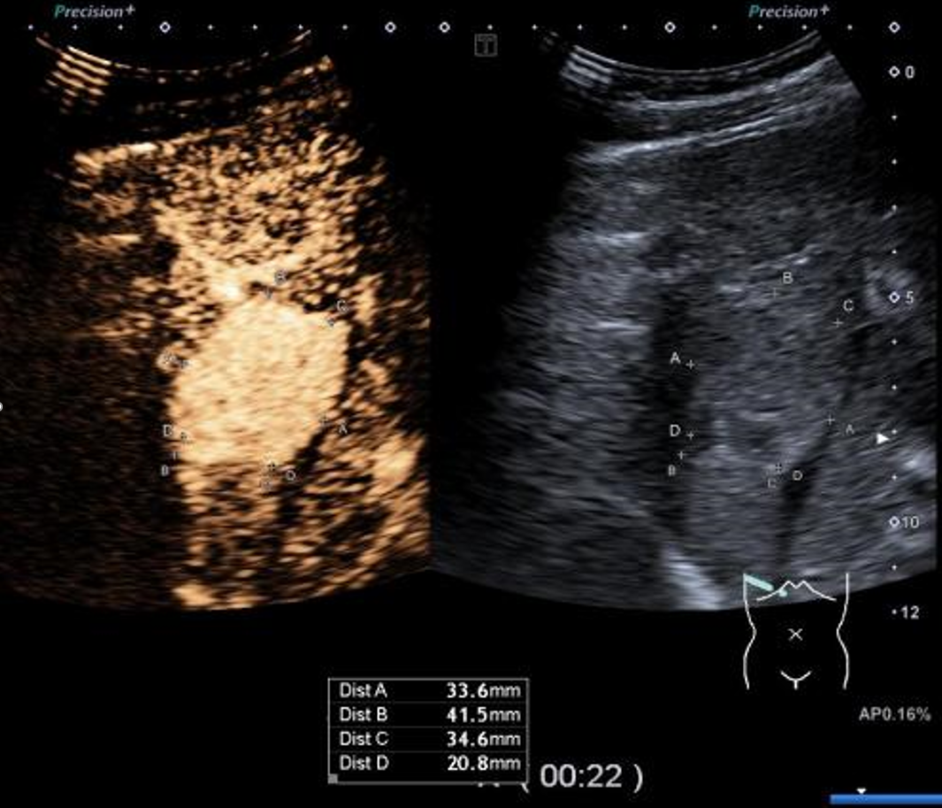 消融完成后,术者退出电极针,经超声造影评估所有消融部位达到安全范围后手术顺利结束,术后给予对症支持治疗,患者恢复良好。术后3天超声造影显示肿瘤部位呈无血供现象,周边血管结构保存完整,消融效果良好且安全。术后1月超声造影显示病灶明显缩小,消融效果显著。